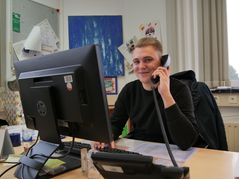 Ich mache eine Ausbildung zum Kaufmann für Büromanagement und lerne dabei alle Bereiche der Verwaltung kennen. Ich wechsle meist so in monatlichem Rhythmus die Abteilungen. Zurzeit arbeite ich in der WfbM. Hier war ich schon einmal und war auch bereits in den Fördergruppen eingesetzt. Das wiederholen wir jetzt noch mal, damit ich ein noch besseres Gefühl für die Arbeit mit behinderten Menschen bekomme.