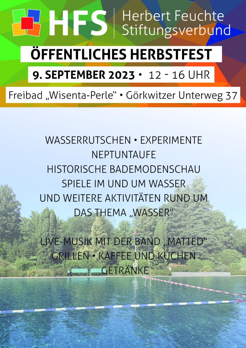 Am Samstag, 9. September laden wir Sie herzlich zu unserem Herbstfest in das Freibad "Wisenta-Perle" ein. Ab mittags von 12 - 16 Uhr erwartet Sie dort ein buntes Aktionsprogramm rund um das Thema "Wasser".