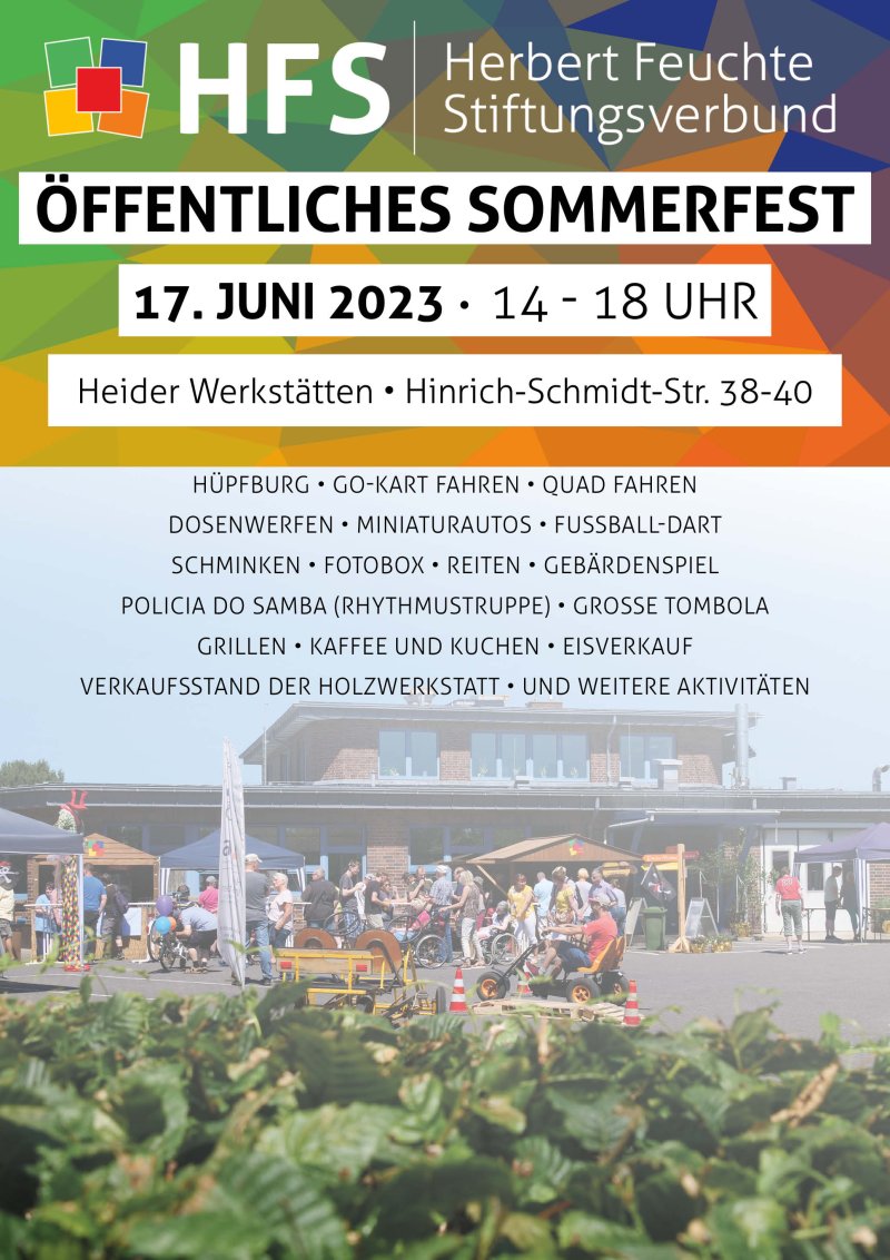 Am Samstag, 17. Juni laden wir Sie herzlich zu unserem Sommerfest in die Heider Werkstätten ein. Am Nachmittag von 14 - 18 Uhr erwartet Sie dort ein buntes Aktionsprogramm.