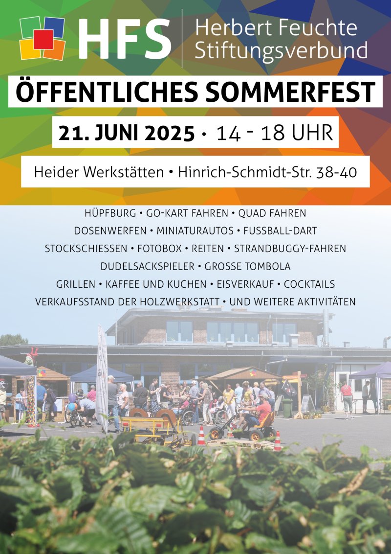 Am Samstag, 21. Juni laden wir Sie herzlich zu unserem Sommerfest in die Heider Werkstätten ein. Am Nachmittag von 14 - 18 Uhr erwartet Sie dort ein buntes Aktionsprogramm.
