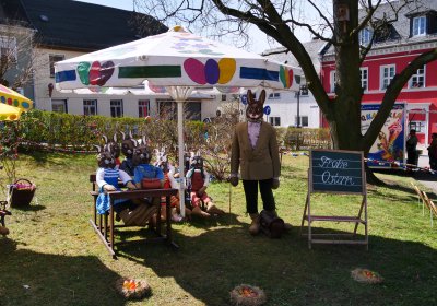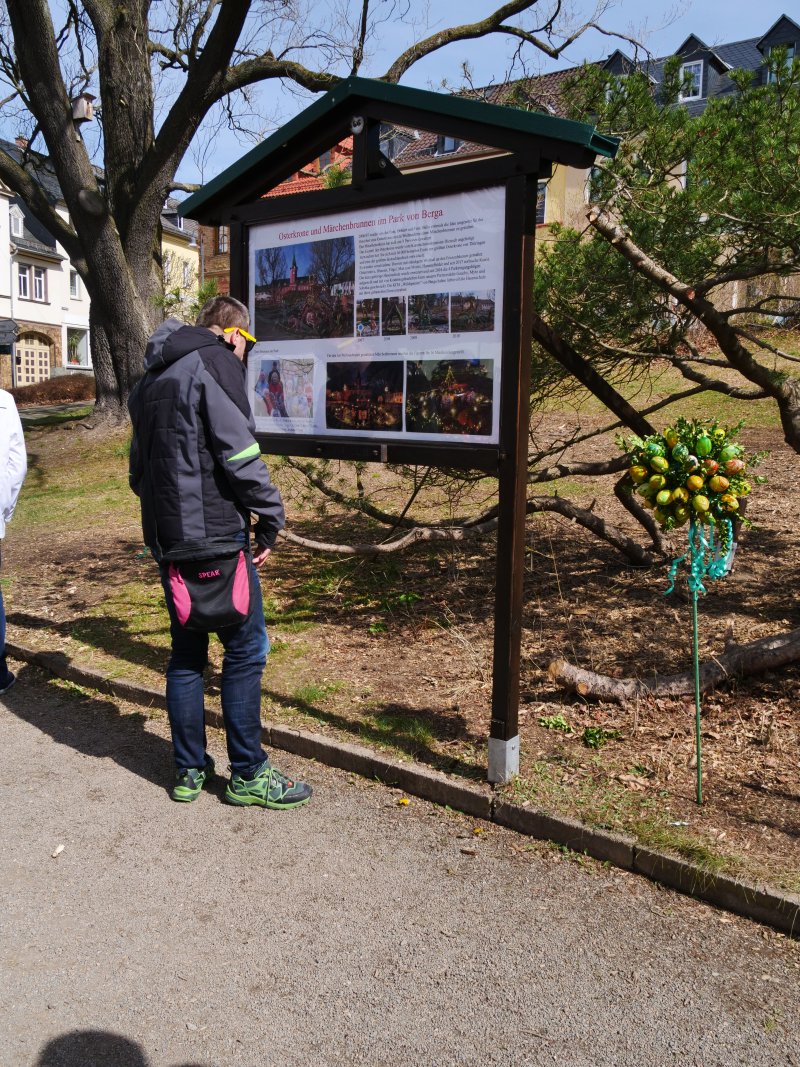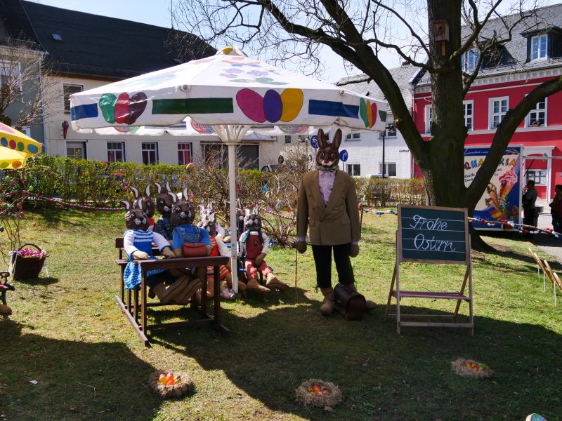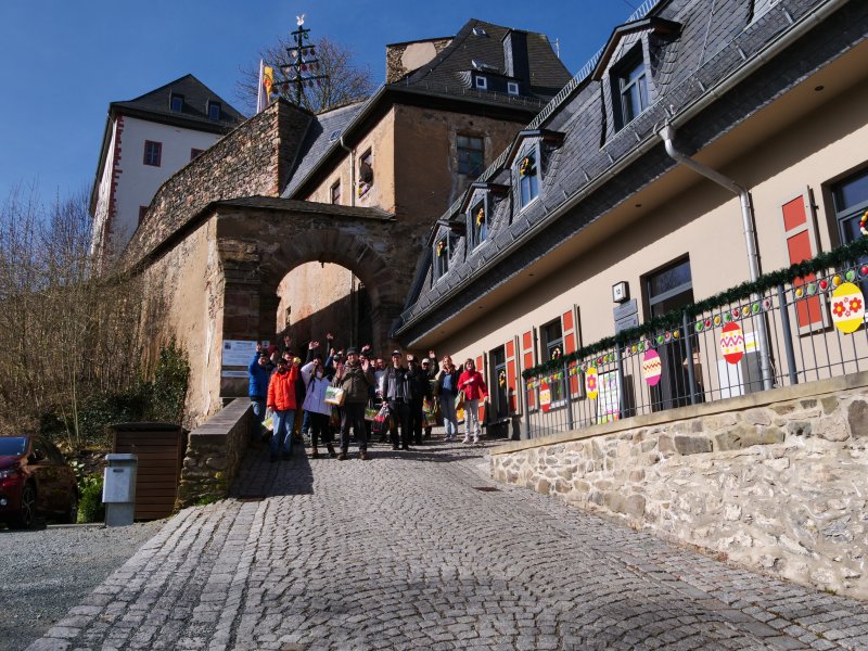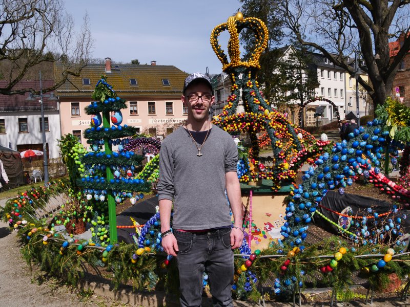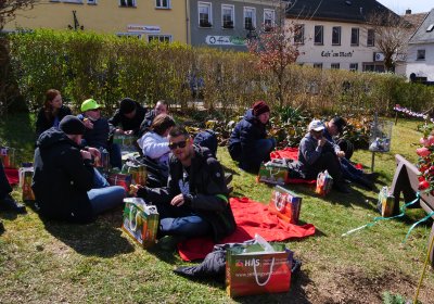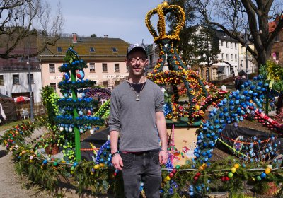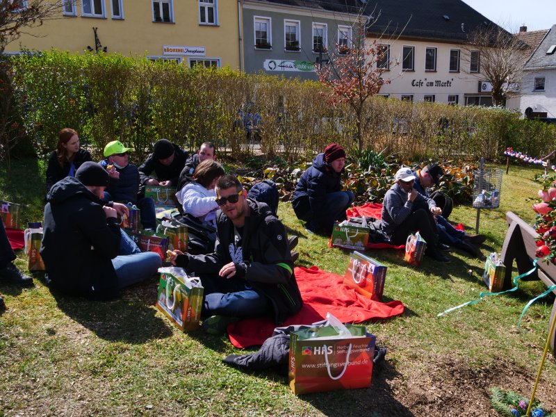 Die Bewohner*innen des Wohnheimes „Wisentablick“ in Schleiz begaben sich auf den „Vogtländischen Osterpfad“. Im Gepäck die Frage: Warum werden in der Osterzeit die Brunnen geschmückt? Viele Ortschaften in Thüringen schmücken rund um die Karwoche ihre Brunnen mit bemalten Eiern, frischem Grün, Blumen und bunten Bändern. Die Pflanzen sollen die aufblühende Natur symbolisieren, die bunten Bänder stehen für die Lebensfreude. Der praktische Grund hinter dem Brauch ist die Pflege der Brunnen. Mit diesem Wissen konnten sich die Teilnehmer*innen ganz hingebungsvoll den wunderschönen Osterfiguren und herrlich geschmückten Brunnenanlagen an den verschiedenen Stationen der Tour widmen. Gedichte in Gebärdensprache, fröhliche Lieder in den Bussen und ein schmackhaftes Picknick sorgten unentwegt für gute Laune. Höhepunkt war der mit ca. 17.000 Eiern verzierte Marktbrunnen in Berga/Elster. Am Ende der Expedition ins Reich des Osterhasen stand eine Thüringer Tradition: das „Eieraufwerfen“. In kleinen gehäkelten Osternetzen werden Ostereier solange in die Luft geschleudert bis sie kaputt sind und verzehrt werden können. Dabei sollten die Eier solange wie möglich nicht zerbrechen. Wer ein dickes Netz hatte, war klar im Vorteil.